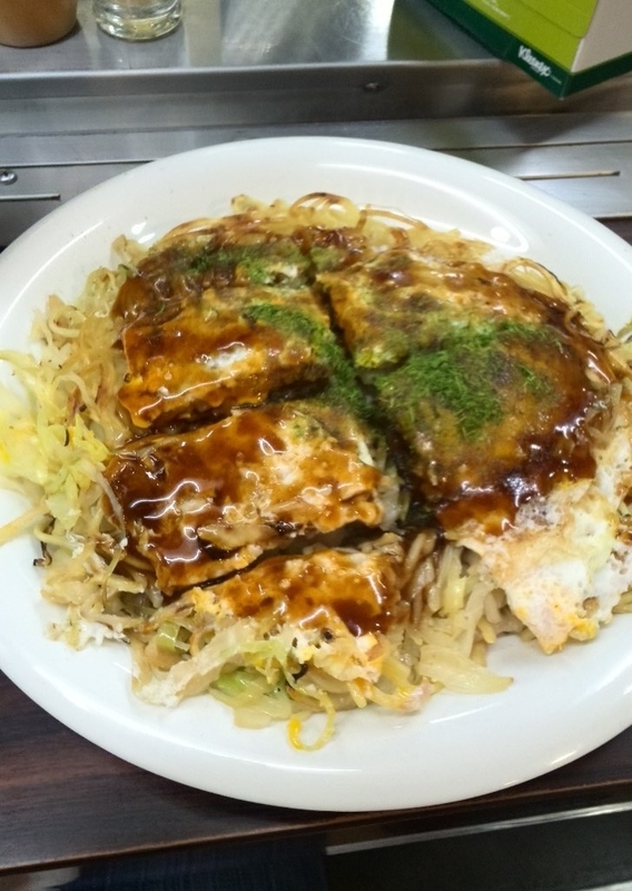焼きそば麺はところどころ焼き目が付けてあり、パリっとしてて、お好み焼きの生地は